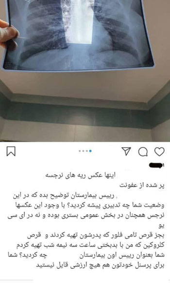 پرستار همراه و دوست نرجس خانعلی زاده پرستار ۲۵ ساله بیمارستان میلاد لاهیجان که جانش را وقف بیماران کرونایی کرد و سرانجام خودش هم به دلیل ابتلا به کرونا درگذشت. در صفحه شخصی خود از رئیس این مرکز درمانی و کمبود امکانات گلایه کرد.