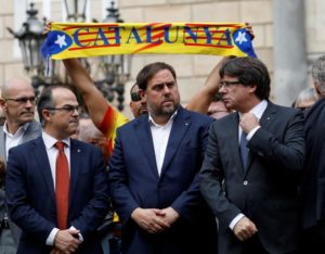 Catalan President Carles Puigdemont and other dignitaries stand in Plaza Sant Jaume in Barcelona