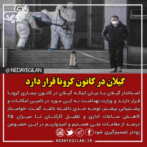 وی تصریح کرد: با توجه به اهمیت پیشگیری از ترددها و مسافرت های غیرضروری به گیلان و محدودیت فوق العاده شدید در ورودی های استان، خواستار کاهش ساعات اداری و تقلیل کارکنان تا میزان ۲۵ درصد از مقامات ملی هستیم و امیدواریم در این خصوص زودتر تصمیم گیری شود.